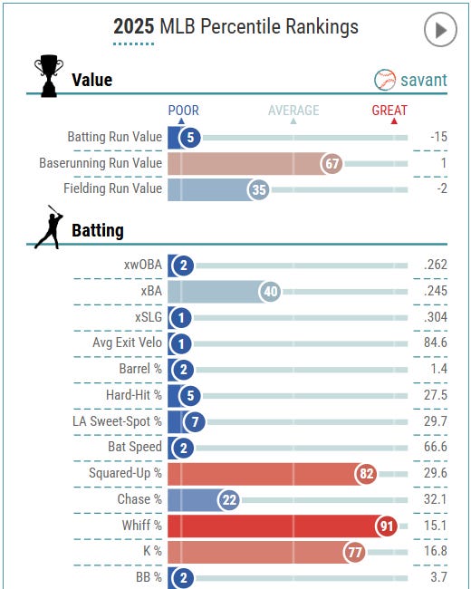 Last season, IKF hit .262 / .297 / .334 and hit TWO home runs in 459 plate appearances. Not only is IKF not going to provide any power, he won’t provide much offensive value (76 OPS+ in 2025). Nothing about his Baseball Savant page screams offensive production.
