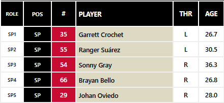 Ranger Suarez and Sonny Gray are pitchers that should adapt well to Fenway. Suarez is a ground ball pitcher who is elite at keeping the ball in the ballpark (0.80 HR/9: 12th in baseball). Sonny Gray is a spin wizard who brings a ton of experience. In this rotation, he will not be asked to lead this rotation but be a steady veteran. Brayan Bello is their #4 coming off a 3.35 ERA in 166 innings.